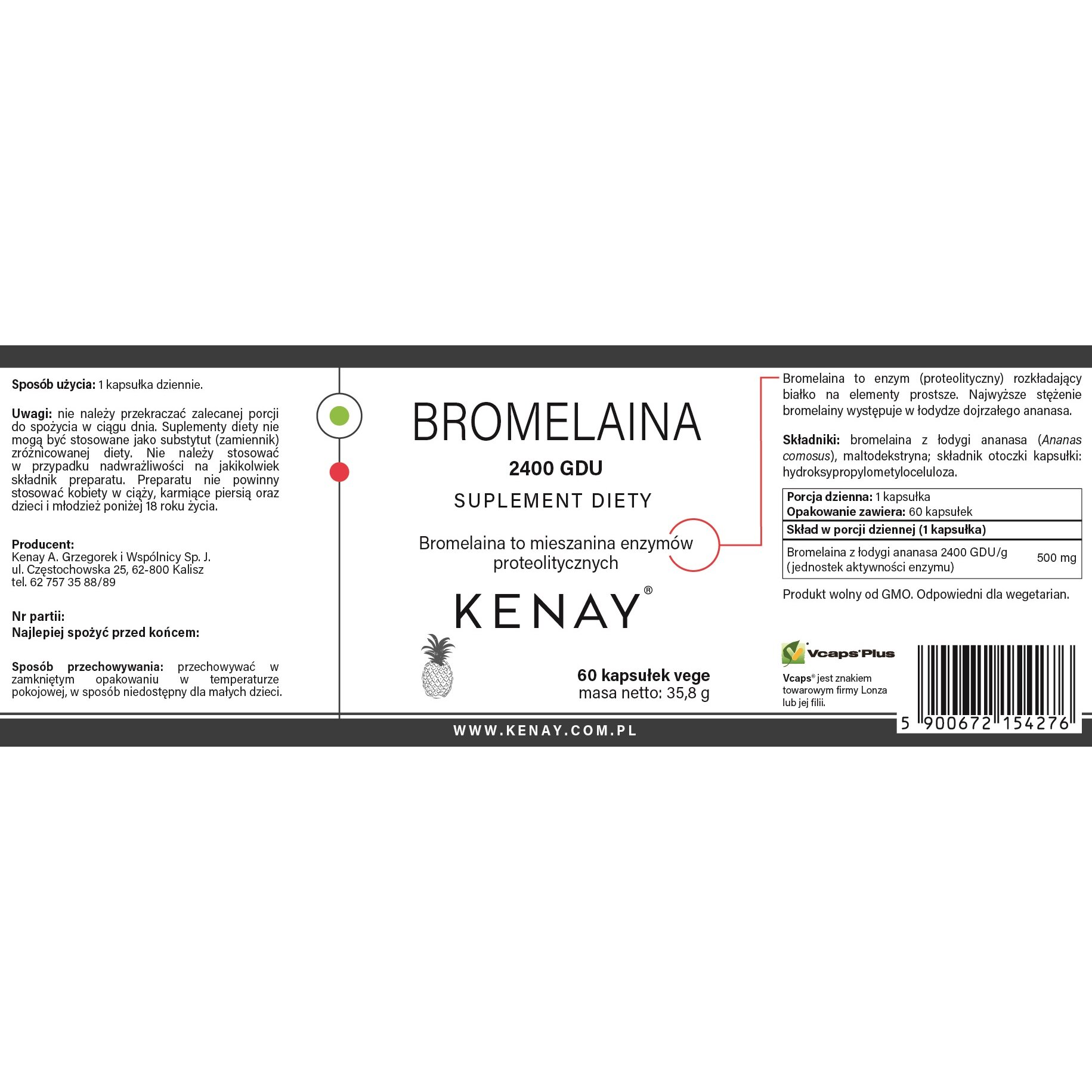 Bromelaina (Ananas comosus) – 600 mg (2400 GDU), substancja nośna: magnezu stearynian, kapsułka żelatynowa.